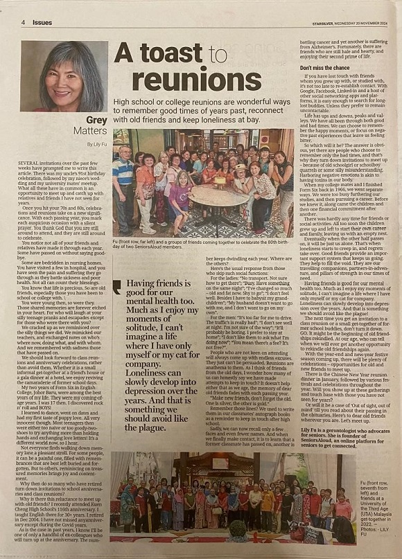 (The above article was first published in the Star on Wed 20 Nov 2024. The online edition can be accessed at https://www.thestar.com.my/lifestyle/family/2024/11/24/starsilver-reunions-can-be-uplifting-and-build-connections-for-seniors.)