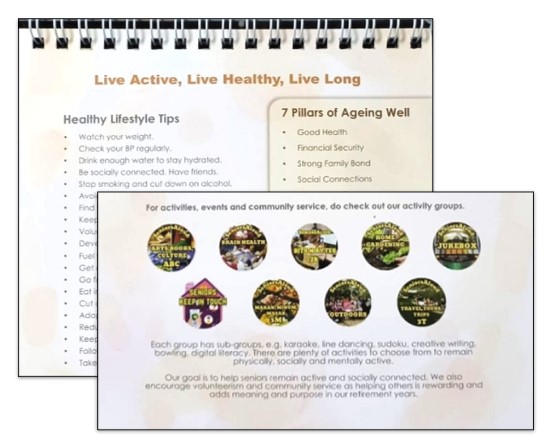The calendar also contains a useful list of Healthy Lifestyle Tips and the 7 Pillars of Ageing Well. You will find these tips most helpful in practising good habits for ageing well. You can refer to them the whole year through and practise them till they become part and parcel of your lifestyle. The calendar also contains the QR-codes for membership registration, SeniorsAloud FB and SeniorsAloud website.