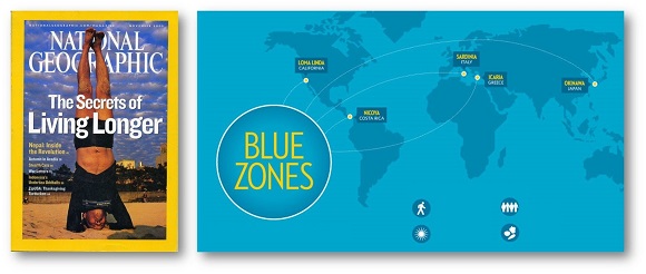 In 2009, I came across a National Geographic article by Dan Buettner. He identified five places in the world which he called Blue Zones where people live the longest, and are healthiest: Okinawa, Japan; Sardinia, Italy; Nicoya, Costa Rica; Ikaria, Greece, and Loma Linda, California.
