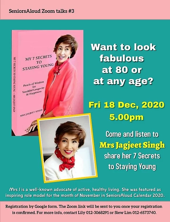 If you have bought our SeniorsAloud calendar 2020, or follow our facebook, you will recognise Mrs Jagjeet as our inspiring senior for November. She has made full use of the stay-home period during Covid-19 to come up with her first self-published book. All done in two months. Amazing! If you want to reach 80 looking fit, healthy and gorgeous like Mrs J, attend her talk where she will share her secrets of looking and feeling great. To register for Mrs Jagjeet’s talk, fill in the form here: https://bit.ly/3o9Yvyz